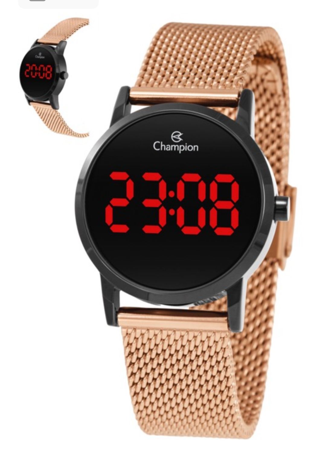 O design digital reinventado para a mulher moderna. Este modelo quebra barreiras ao unir a funcionalidade do visor LED vermelho (sobre um fundo preto minimalista) com a sofisticação clássica da pulseira em malha mesh Rose Gold. Enquanto o mostrador redondo traz uma estética clean e futurista, a pulseira de aço texturizada garante que a peça funcione como um acessório de moda elegante, e não apenas esportivo. É a fusão definitiva entre o conforto da tecnologia e o requinte do metal nobre.